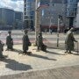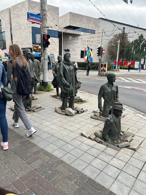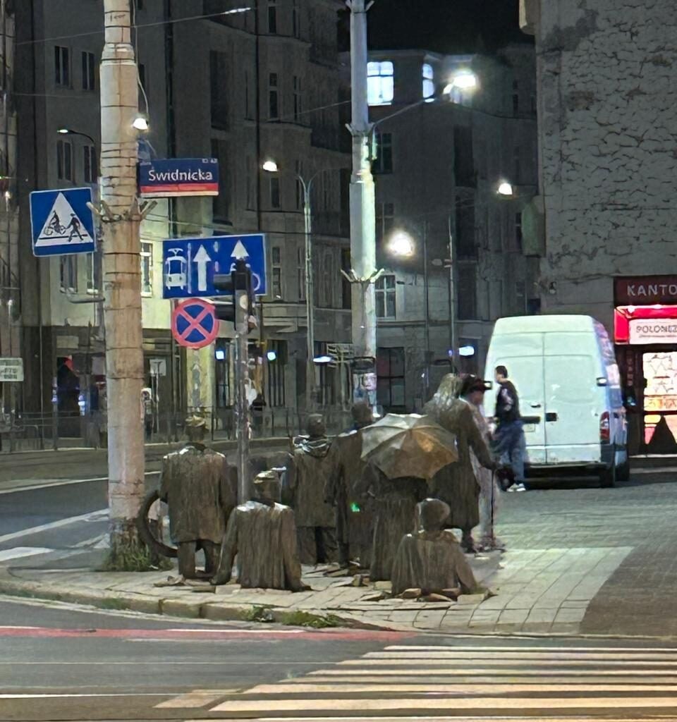 Instalação do artista polonês Jerzy Kalina, Transição 1977-2005, colocada na calçada de uma das principais avenidas de Wroclaw. cruzamento das ruas Świdnicka e Piłsudskiego. Jerzy Kalina registrou magnificamente esse eterno caminhar dos povos, que são manipulados como se fossem parte de um teatro de fantoches.